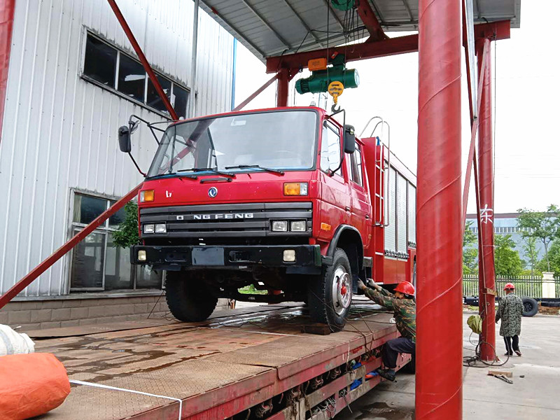圖片為:兩臺東風救援消防車陸續(xù)開上平板車。發(fā)往目的地
